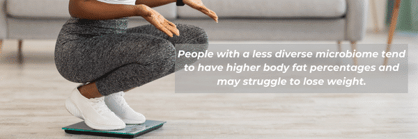 Videre har visse typer tarmbakterier vært knyttet til fedme og vektøkning. Studier har vist at personer med et mindre mangfoldig mikrobiom har en tendens til å ha høyere kroppsfettprosent og kan slite med å gå ned i vekt. Dette er fordi tarmbakteriene kan påvirke måten kroppene våre absorberer og lagrer fett.